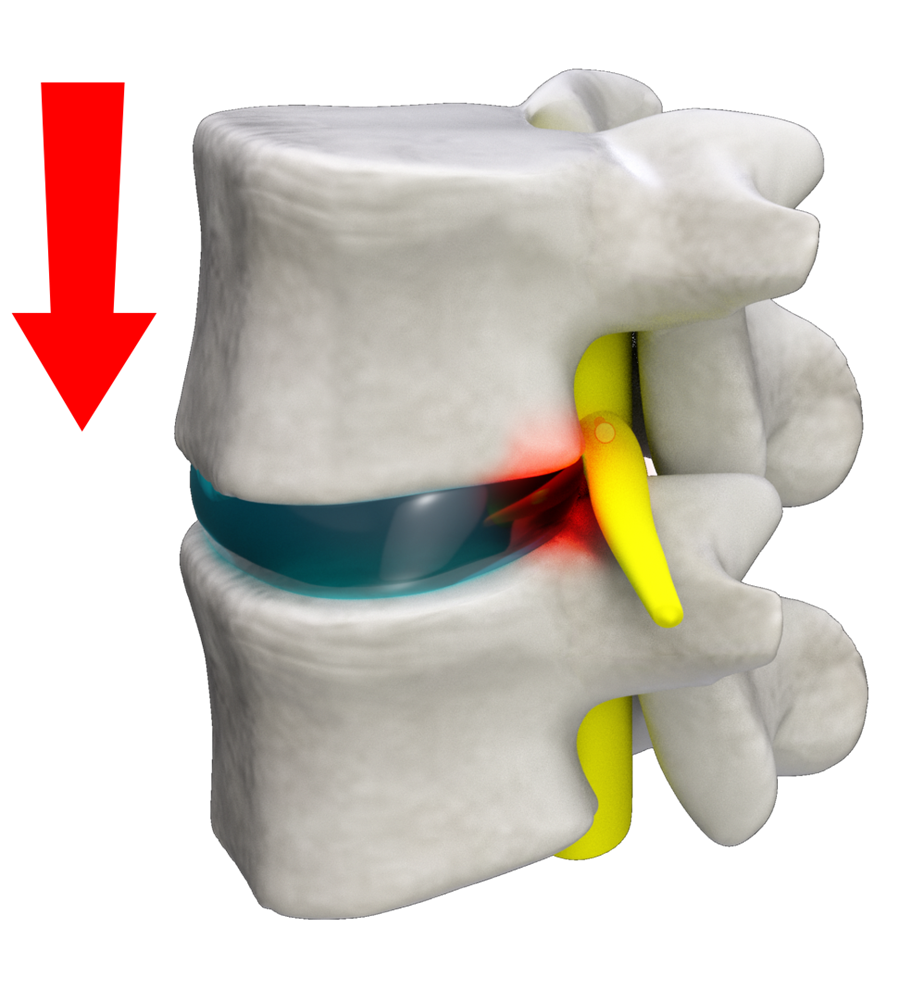 椎體下塌時會導致椎間盤突出,縮小椎管空間並壓迫神經,而形成椎管狹窄,引發坐骨神經痛。 |