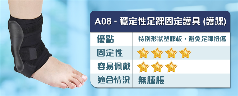 3. A08 - 穩定性足踝固定護具 (護踝) 適用症狀: 固定二級足踝扭傷(拗柴),沒有腫脹,治療慢性韌帶鬆弛、足踝不穩。 特點: 足踝內外側有成形膠板龍骨固定支撐足踝,避免再次壓傷。 |