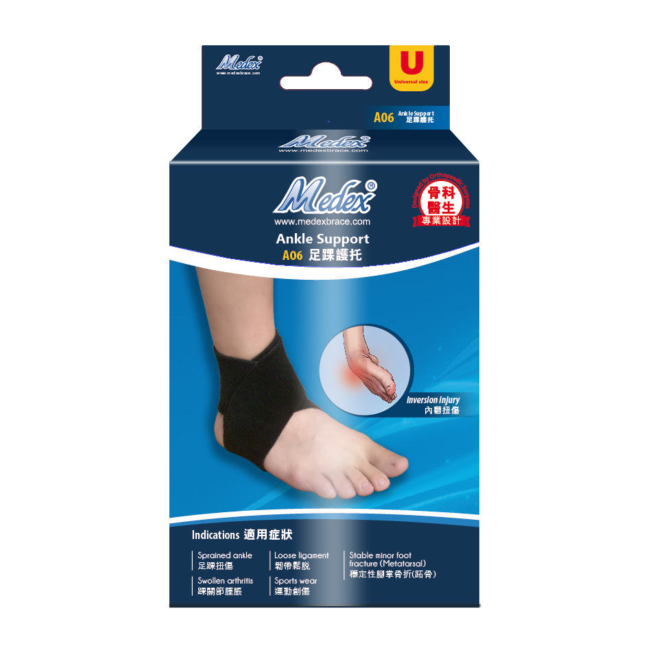 A06 - 包紮式足踝護托﹕獨特8字式包紮設計,彈性布料,配戴護托後,亦可穿鞋,加強足踝穩定,舒緩痛楚腫脹,固定及加強足踝穩定,保護受傷之足踝及預防工作和運動創傷。